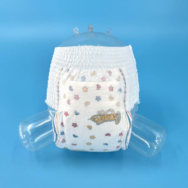 Product structure: Upper & lower tissue (or airlaid ),Coton core (mix with SAP), Topsheet hydrophiic nonwoven, ADL nonwoven, Leak culthvdrophobic nonwoven,3D core coating, Back sheet, Waist nonwoven, Printed cartoon tissue, Waist elastic, $ elastic, Easy tape